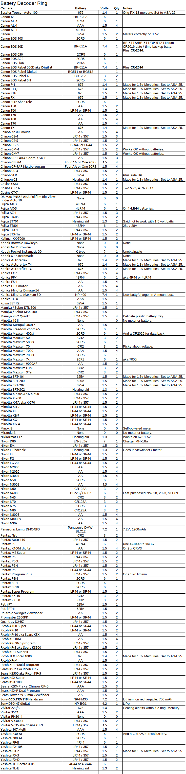 11-23-23 Added links to major sections, since it takes so long to scroll down. Cameras are listed alphabetically.